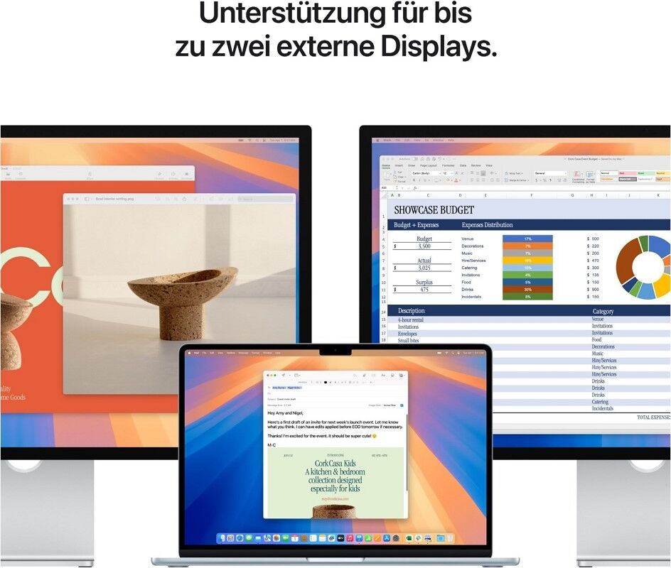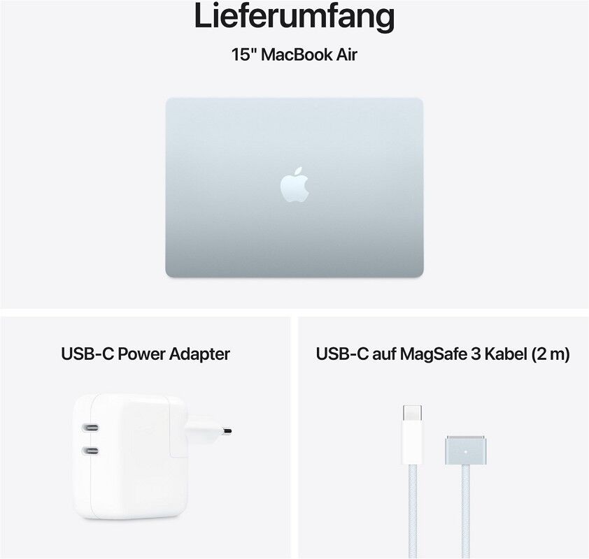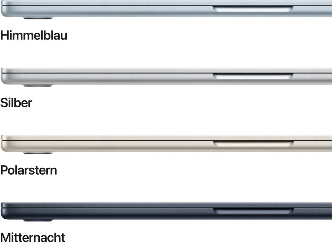 ³ Das Display des 15" MacBook Air hat oben gerundete Ecken. Als Standard-Rechteck gemessen hat das Display eine Diagonale von 15,3" (38,91 cm). Der tatsächlich sichtbare Displaybereich ist kleiner.
